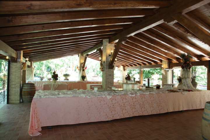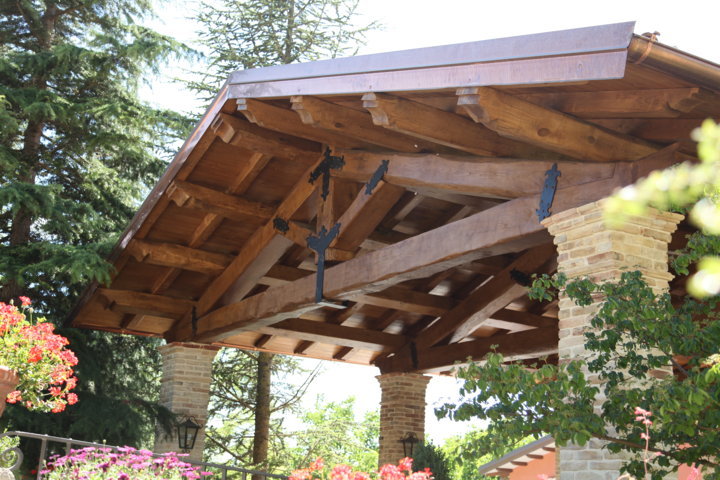 Portico d'ingresso realizzato con capriate, di tipo Palladio, in legno massiccio di castagno.